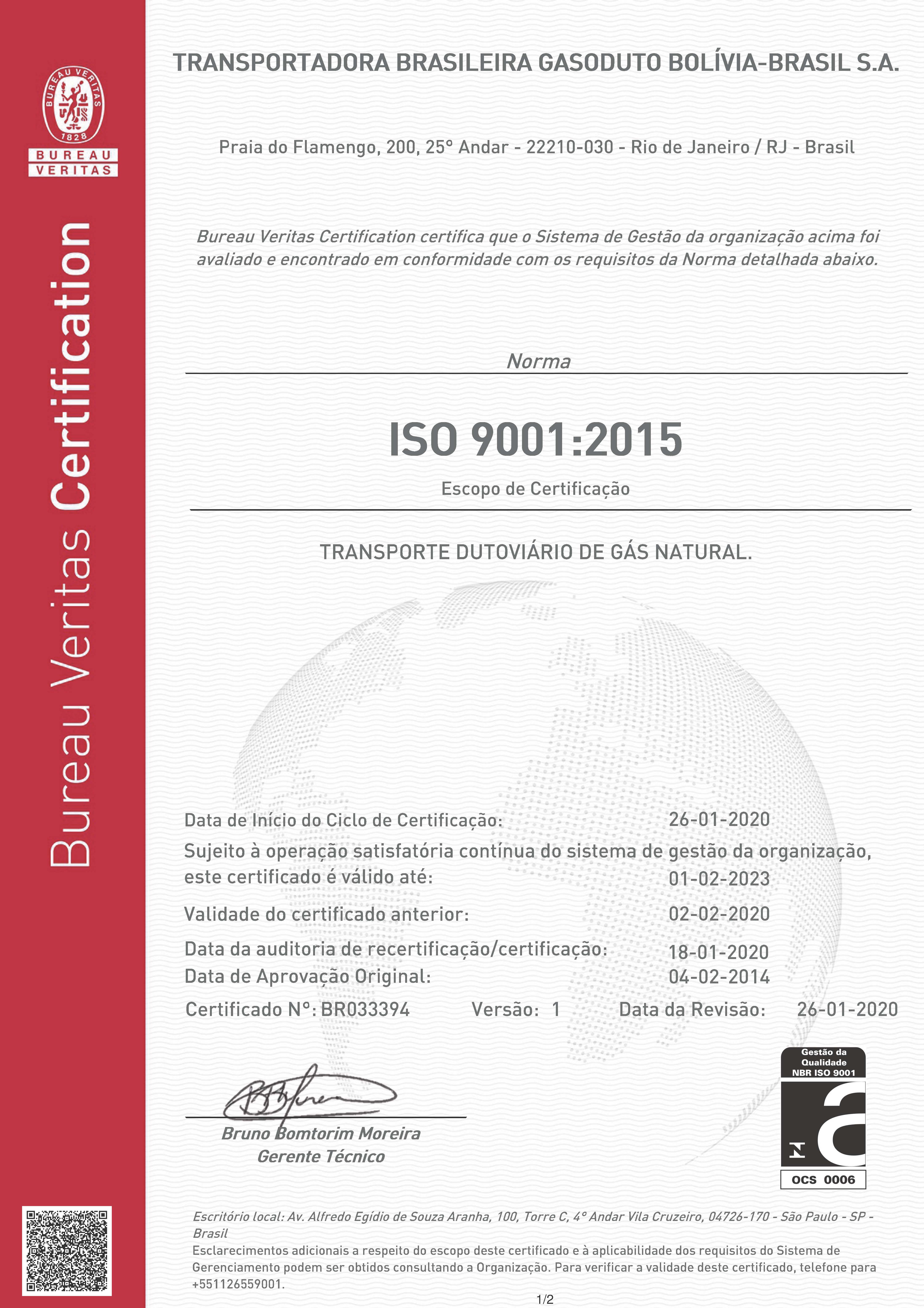 The TBG Integrated Management System (SGI) is a method for managing the company's Natural Gas Pipeline Transport processes and activities, involving matters of Quality, the Environment, Occupational Health and Safety and Measurement, based on internationally recognized standards such as NBR ISO 9001:2015 (Quality Management System), NBR ISO 14001:2015 (Environmental Management System), NBR ISO 10012:2004 (Measurement Management System) and OHSAS 18001:2007 (Occupational Health and Safety Management System). In the case of the Measurement Management System, based on NBR ISO 10012:2004, the scope of the certification covers the processes for the Management of Systems for the Measurement of Natural Gas Volume for Transfer of Custody.