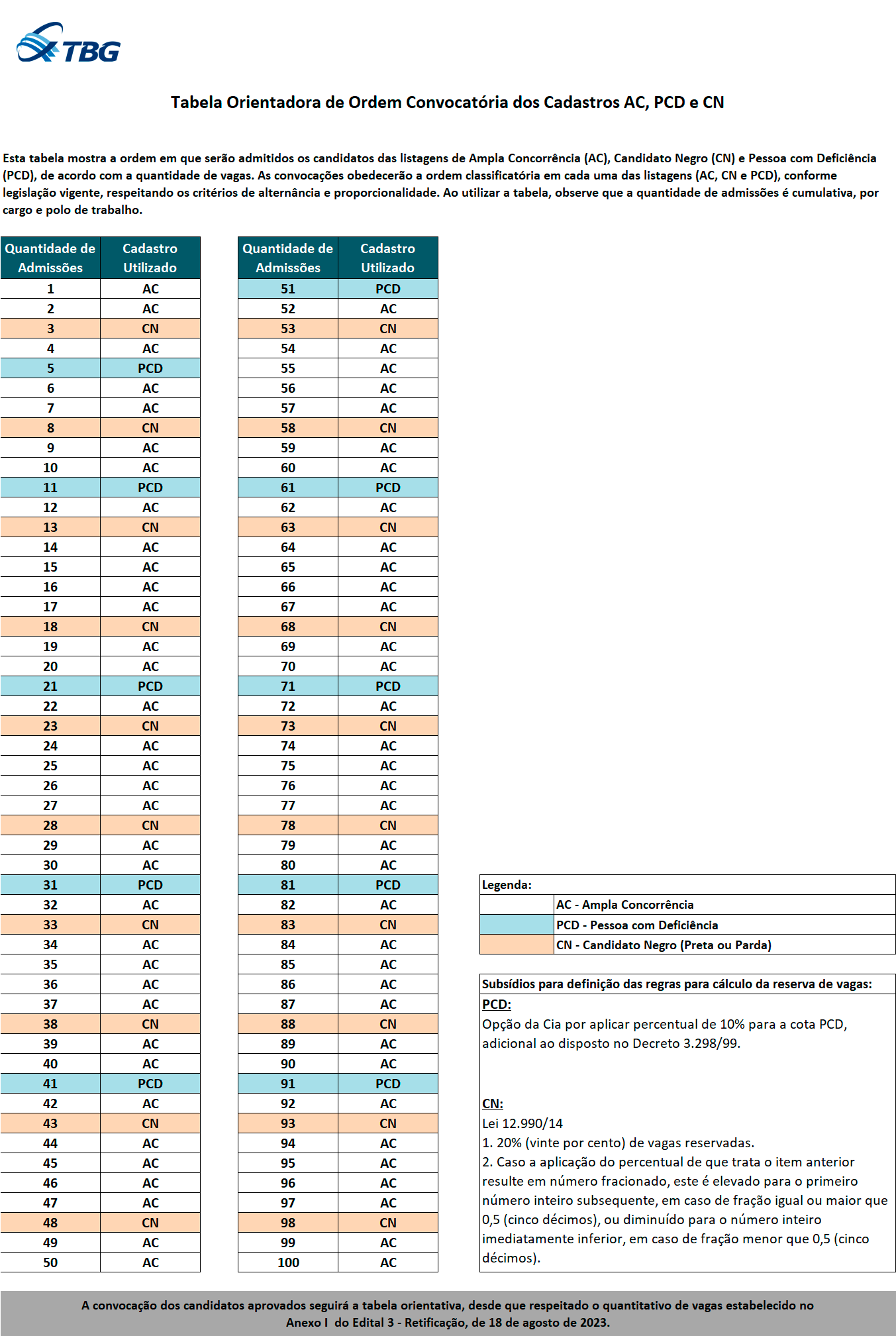 Acompanhe a ordem em que serão convocados os candidatos das listagens de Ampla Concorrência (AC), Candidato Negro (CN) e Pessoa com Deficiência (PCD), de acordo com a quantidade de vagas.