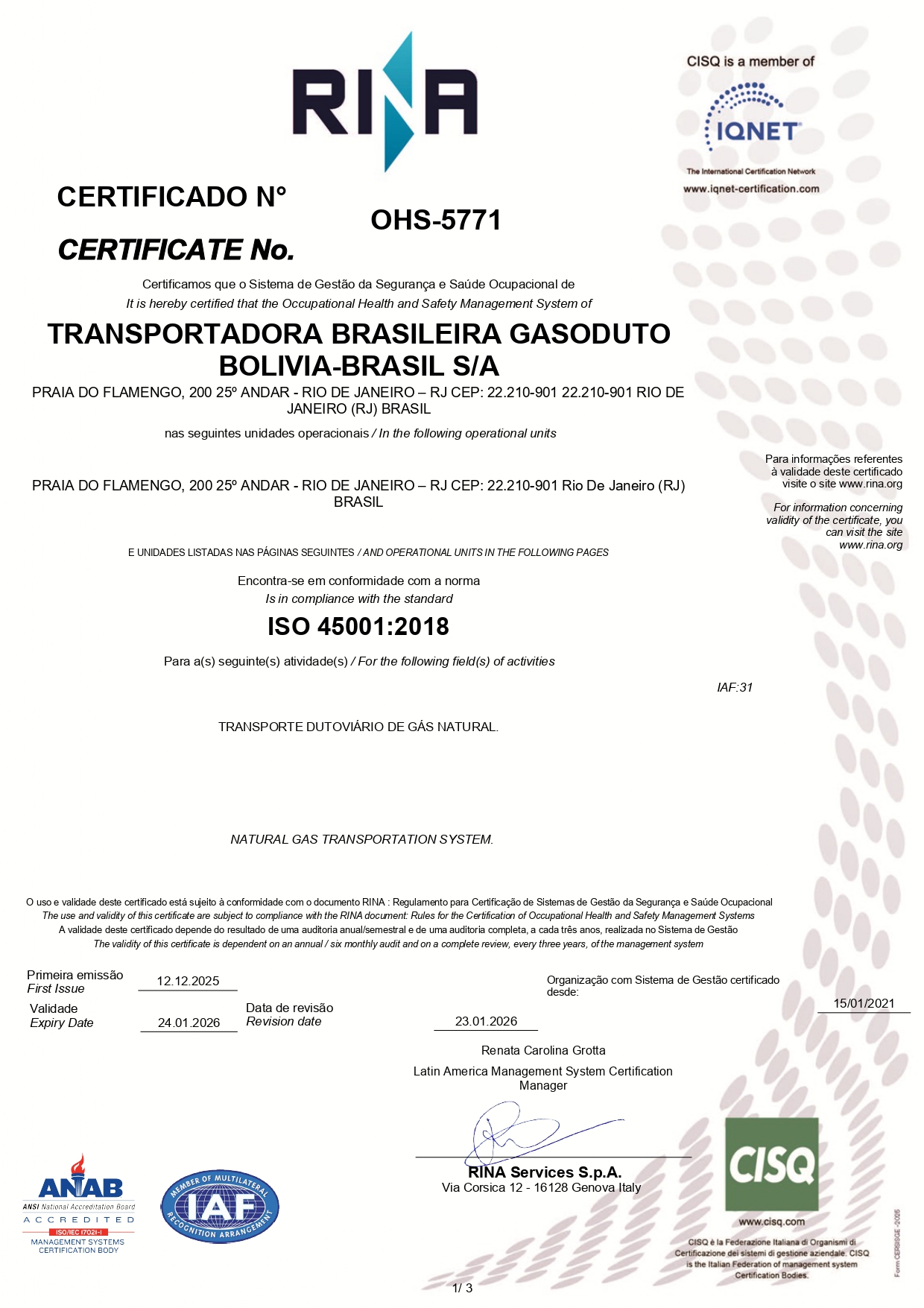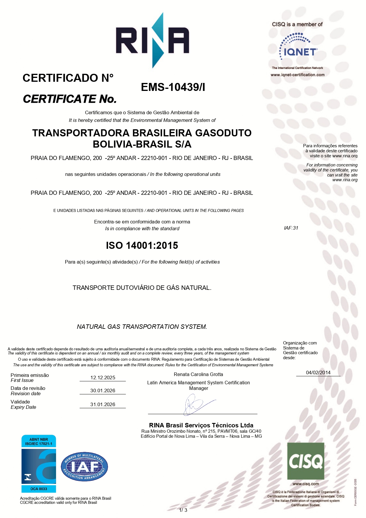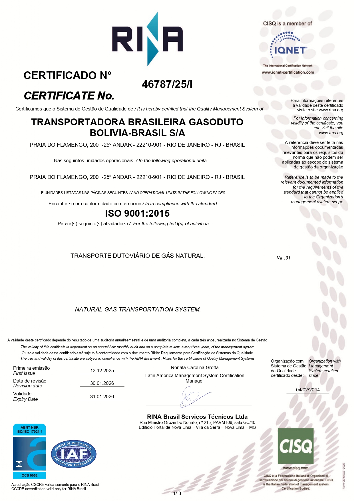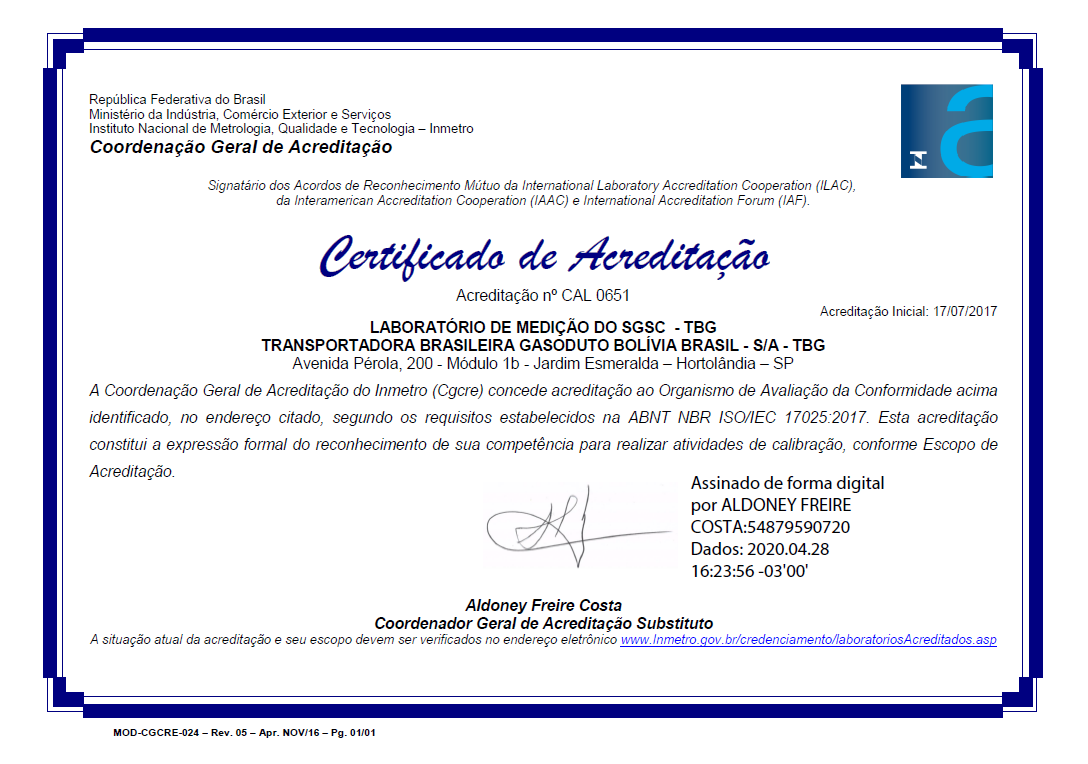 Em janeiro de 2020, a TBG recebeu do Instituto Nacional de Metrologia, Qualidade e Tecnologia (Inmetro) a manutenção da acreditação na norma ABNT NBR ISO/IEC 17025:2017, conferida ao seu Sistema de Gestão do Serviço de Calibração – SGSC. A acreditação do Inmetro tem por objetivo ampliar a oferta de serviços de calibração disponíveis no parque industrial nacional sem perder a qualidade e a rastreabilidade metrológica essenciais à obtenção de resultados de medição confiáveis. A TBG foi a primeira transportadora dutoviária brasileira a conseguir a acreditação.