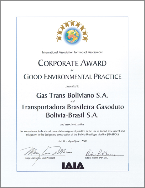Como reconhecimento pelo trabalho desenvolvido na obra de construção do Gasoduto Bolívia-Brasil, a TBG recebeu em junho de 2001, na cidade de Cartagena, na Colômbia, o Corporate Award for Good Environmental Practice, concedido pela International Association for Impact Assessment - IAIA (ONG de cunho científico com grande prestígio internacional e 2.500 representantes em mais de 100 países), como o empreendimento com melhor Gestão Ambiental.