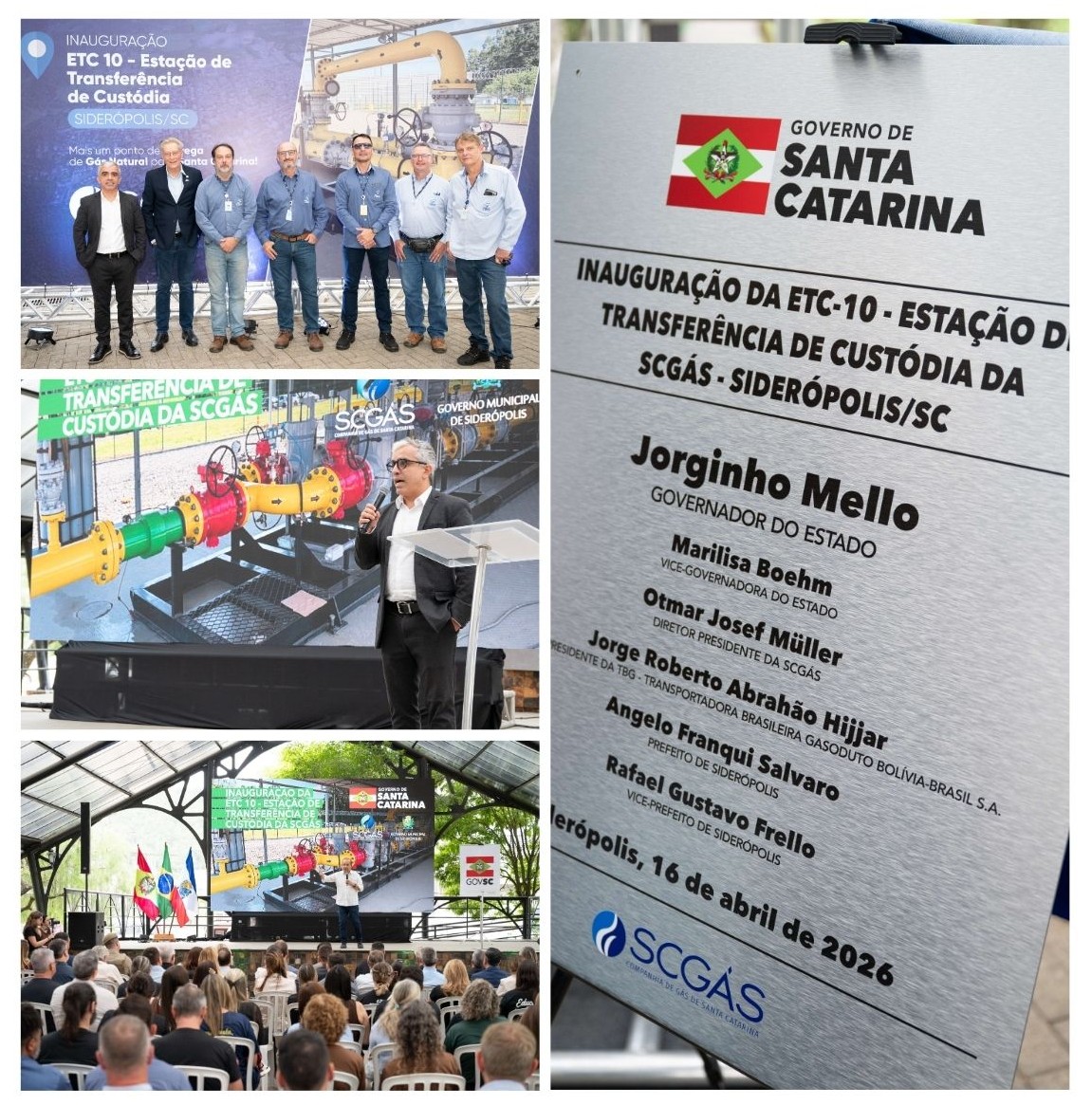 Como representantes da TBG, participaram do evento Robson Coelho, gerente de Regulação; Felipe Borgli, gerente de Manutenção e Élcio Paranhos, coordenador de Manutenção, que acompanharam a entrega da nova estrutura. A cerimônia contou ainda com a presença de Jorginho Mello; governador de Santa Catarina; Otmar Josef Müller, diretor-presidente da SCGás; além de autoridades municipais e da comunidade local.